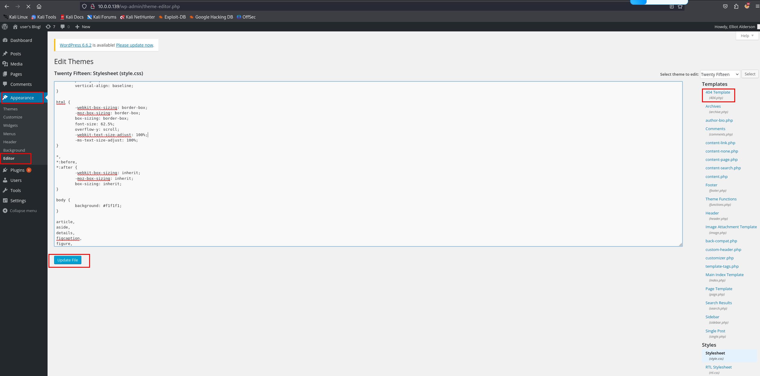 16、将php-reverse-shell.php文件内容复制到WordPress中editor页面的404.php文件中,点击"upload files"。