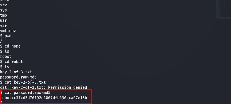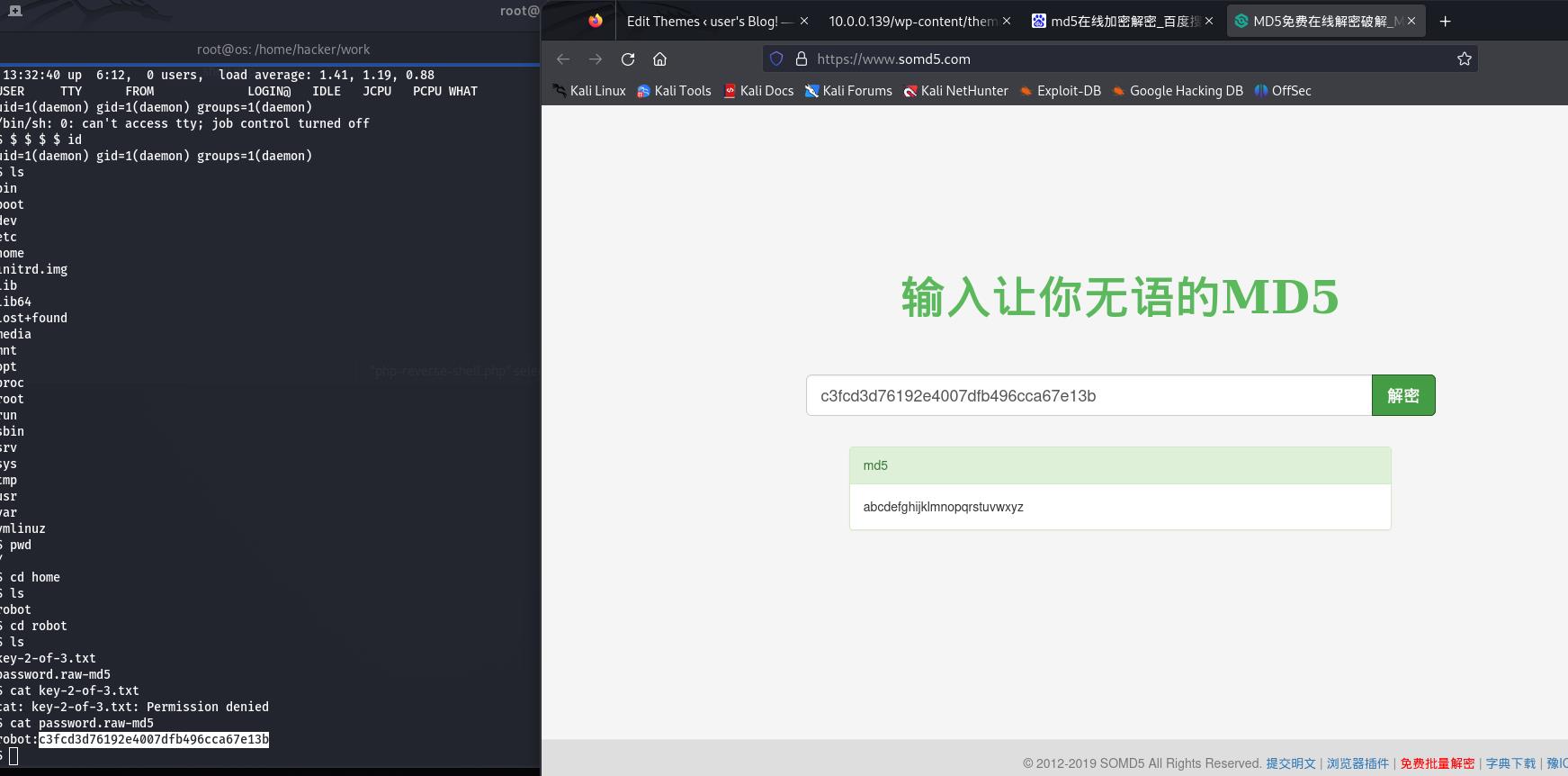 使用cat 命令查看password.raw-md5,可以查看到。文件名提示了MD5加密。进行在线MD5解密。