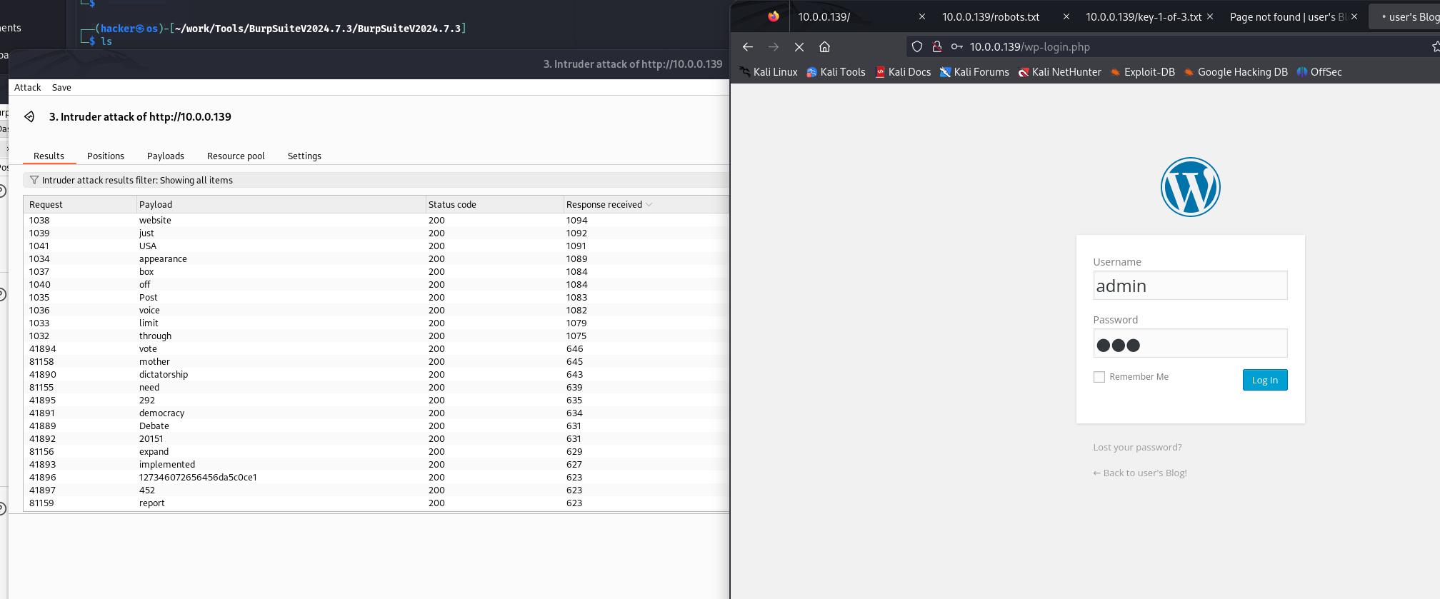 使用之前发现fsocity.dic字典文件,爆破出账号和密码。