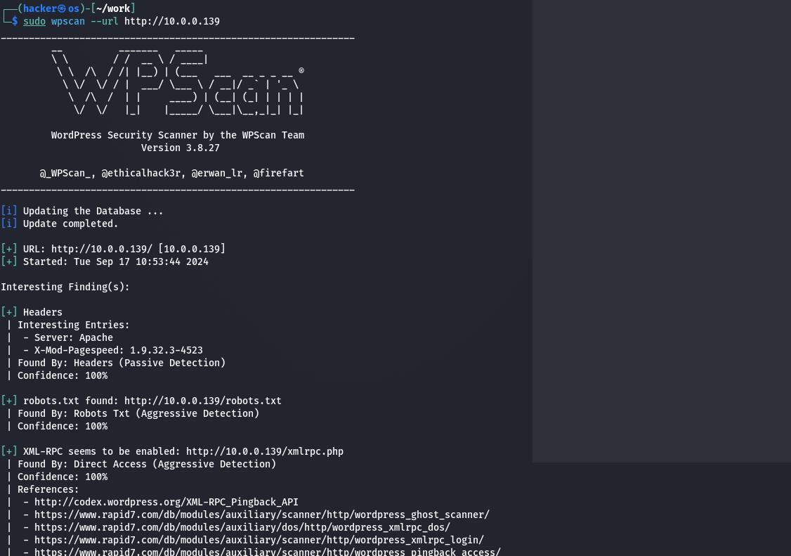 查看网站是由WordPress架构部署的。kali里面有针对WordPress的专用工具wpscan。